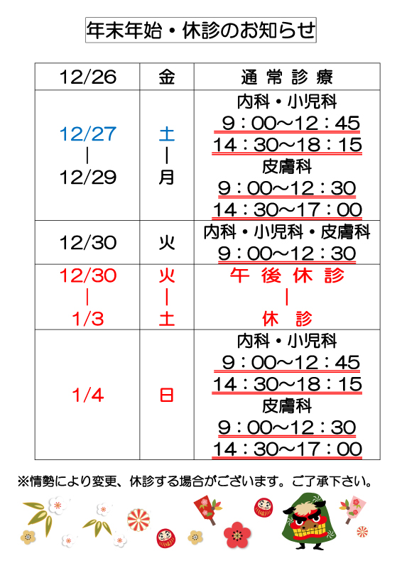年末年始期間中の診療は、以下の通りになります。
