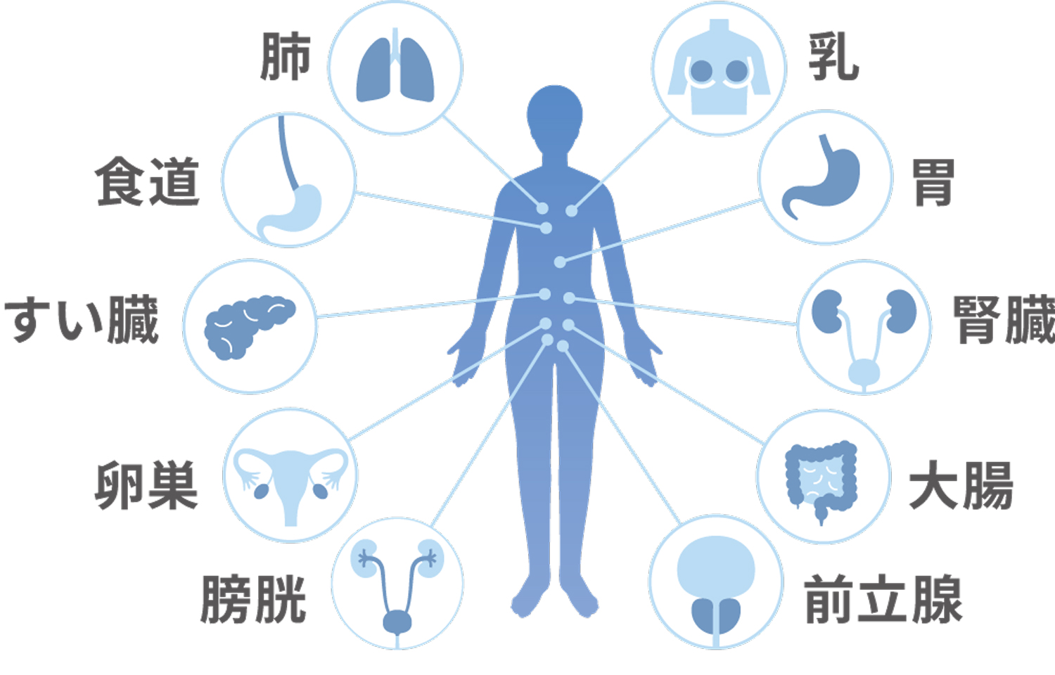 尿を採取するだけの検査で、手軽で、高精度であり、体の負担がありません。 また、マイシグナル検査では、最大で一度に10個のがん腫のリスクを部位別に判定することが可能です。検査できるがん種は、肺がん、胃がん、乳がん、卵巣がん、膵臓がん、食道がん、大腸がん、腎臓がん、膀胱がん、前立腺がんの10種です。 マイシグナル検査によりどのがんのリスクが高いか判定し、リスクに応じて、当院で必要な追加検査をおこないます。